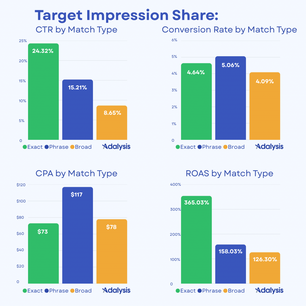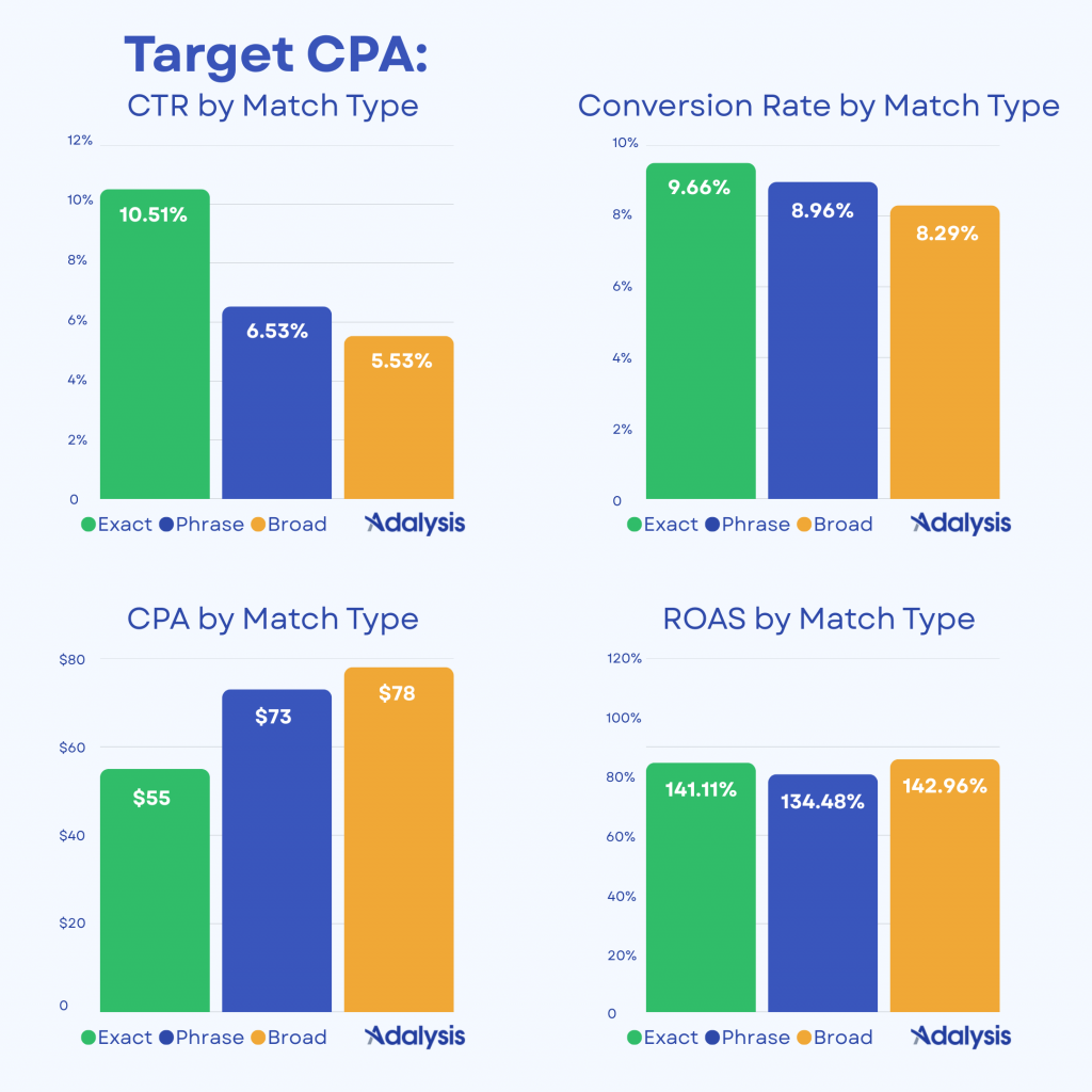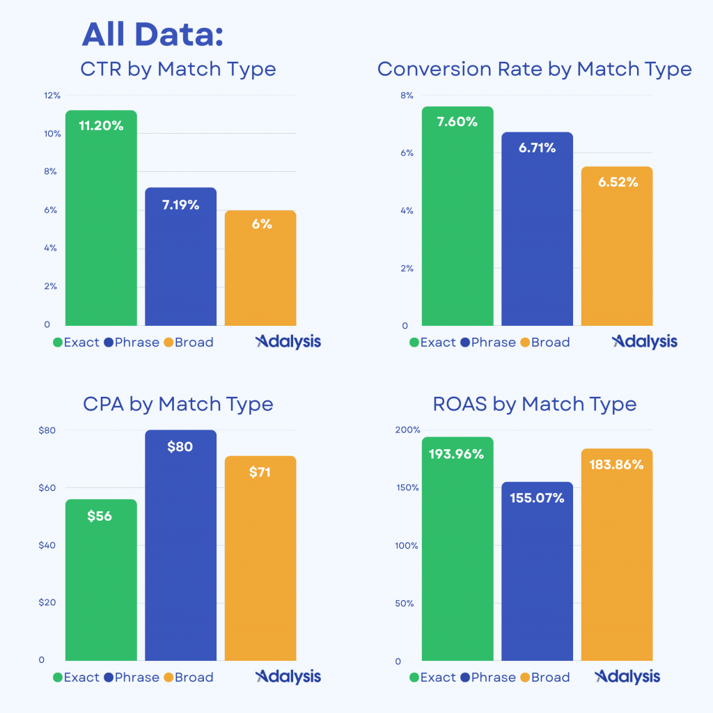 Efficiency is where exact match shines. It delivers higher CTRs, conversion rates, and ROAS while maintaining lower CPAs than both phrase and broad match.