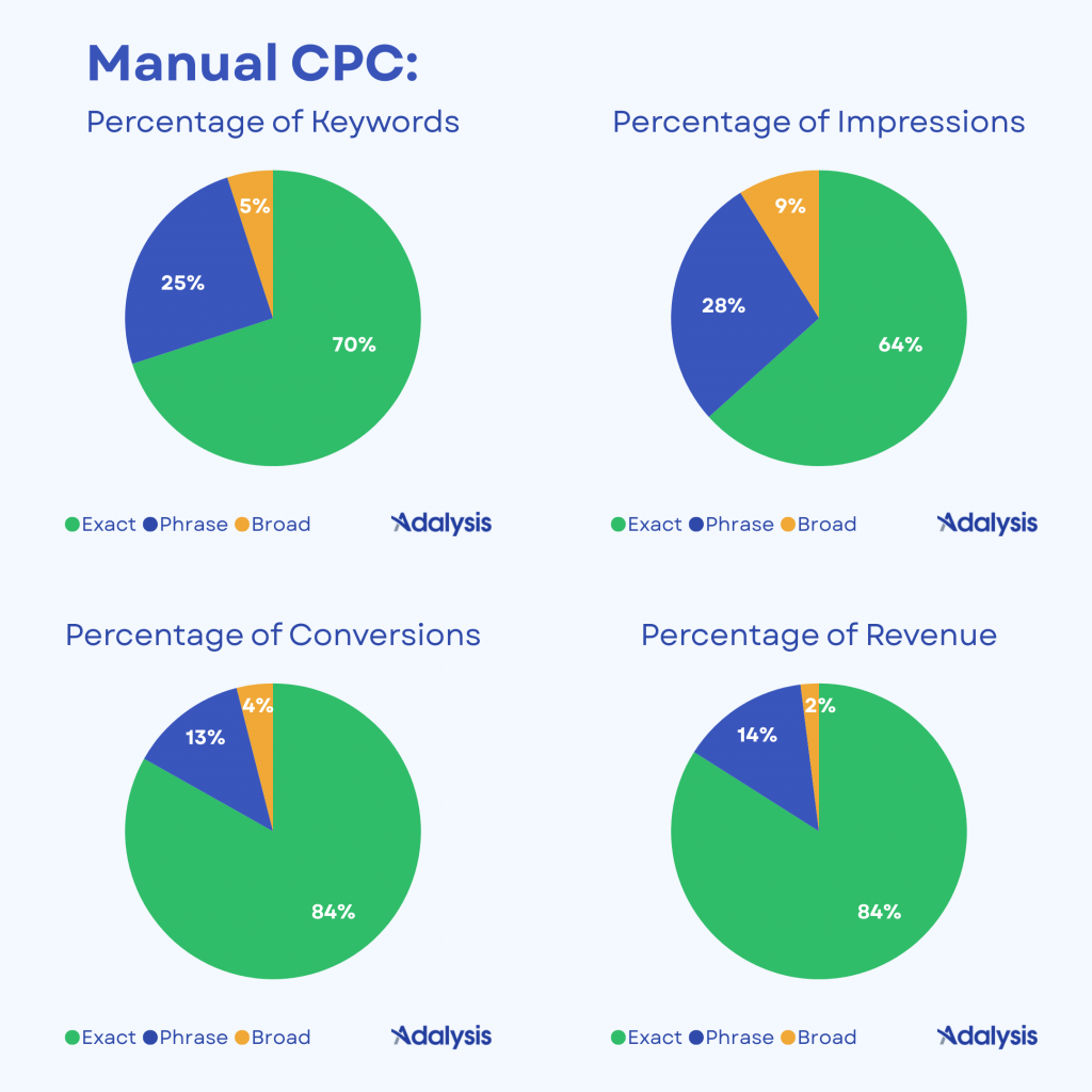 Exact match dominates this category, making up 70% of all keywords in Manual CPC campaigns. Exact match also has the highest percentage of clicks, conversions, and revenue.