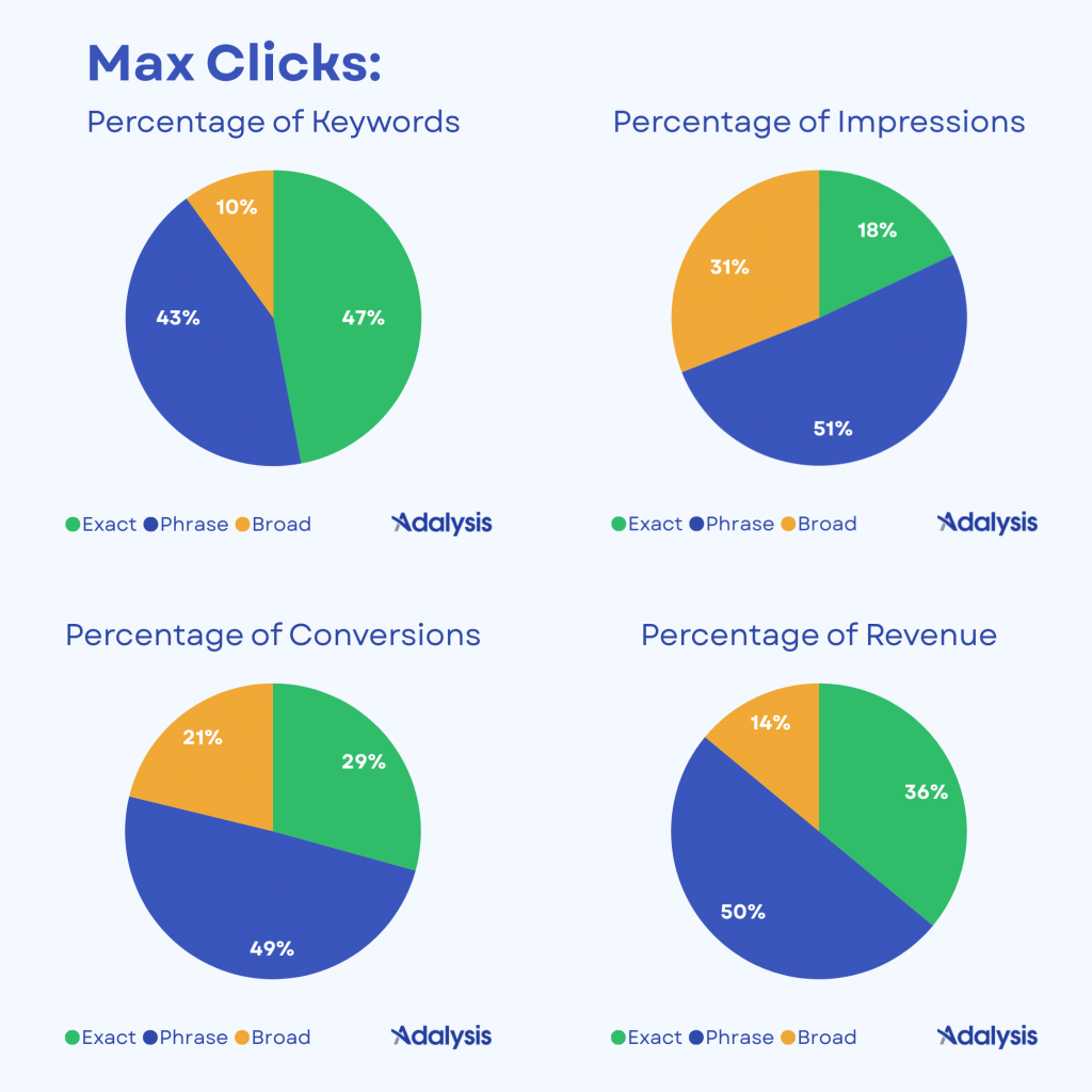 While exact and phrase are used more frequently than broad match, the distribution of clicks is nearly equal across all three match types.