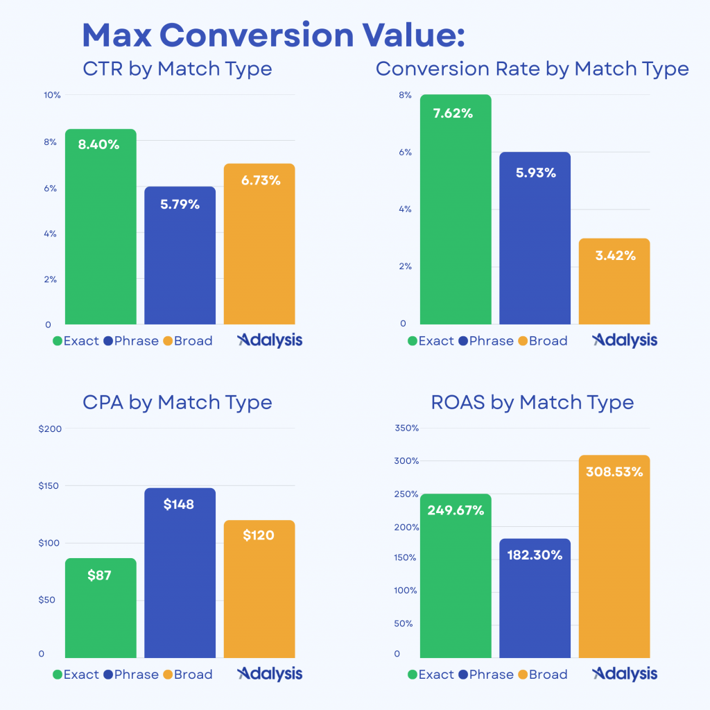 With Max Conversion Value bidding, broad match had a significantly higher CPA than exact match, but it also had a higher ROAS. You rarely see these two facts together since a high CPA usually means a poor ROAS.