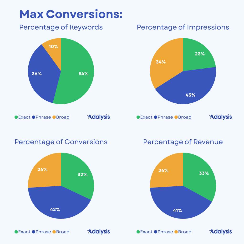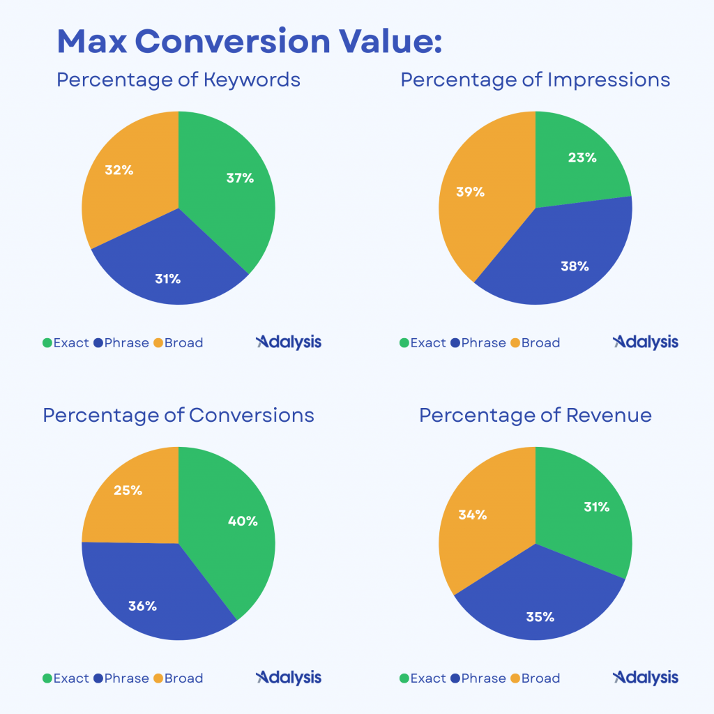 We also see fewer extremely poor search terms for phrase match keywords when using Target ROAS compared to Max Conversion Value. Broad match keywords show ads for a lot of search terms: 25% of keywords, but 46% of impressions. However, the match type holds its own with 35% of conversions and 35% of revenue.