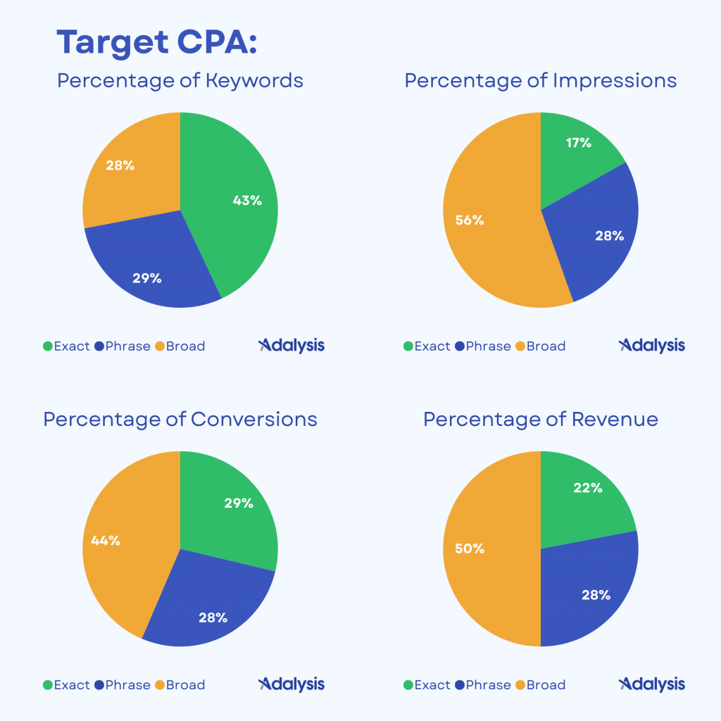 Advertisers using Target CPA rely heavily on exact match as it makes up 43% of keywords. However, phrase and broad match are also significant, making up 29% and 28% of the keywords respectively. Once again, broad match generates a much larger percentage of impressions than the keyword count suggests. Over half of all impressions generated by Target CPA bidding come from broad match keywords.