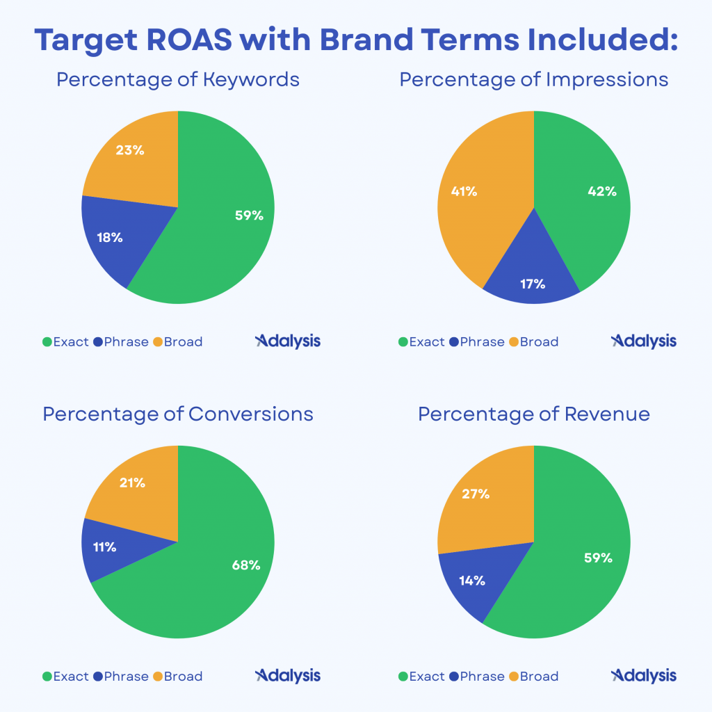 The overall percentage of keywords used and conversion-to-revenue ratios remain similar to non-brand Target ROAS data by match type.