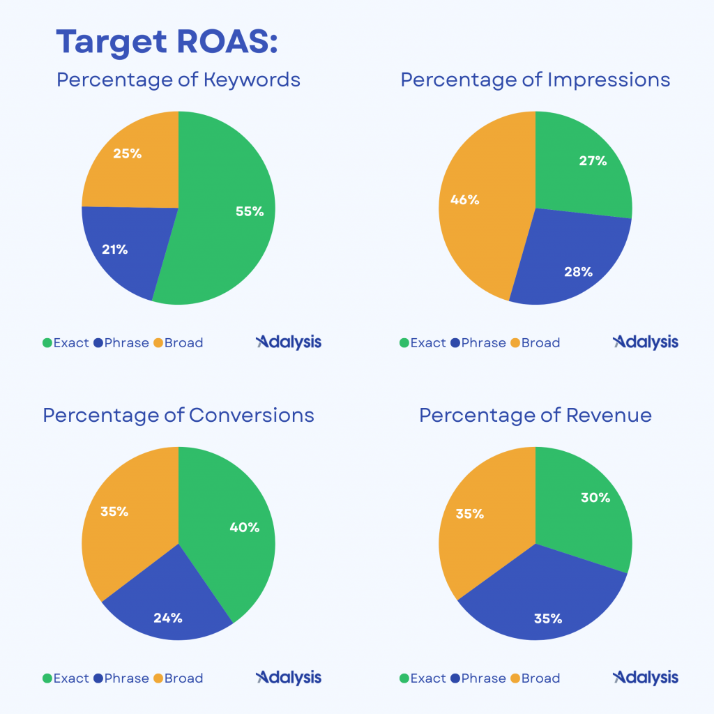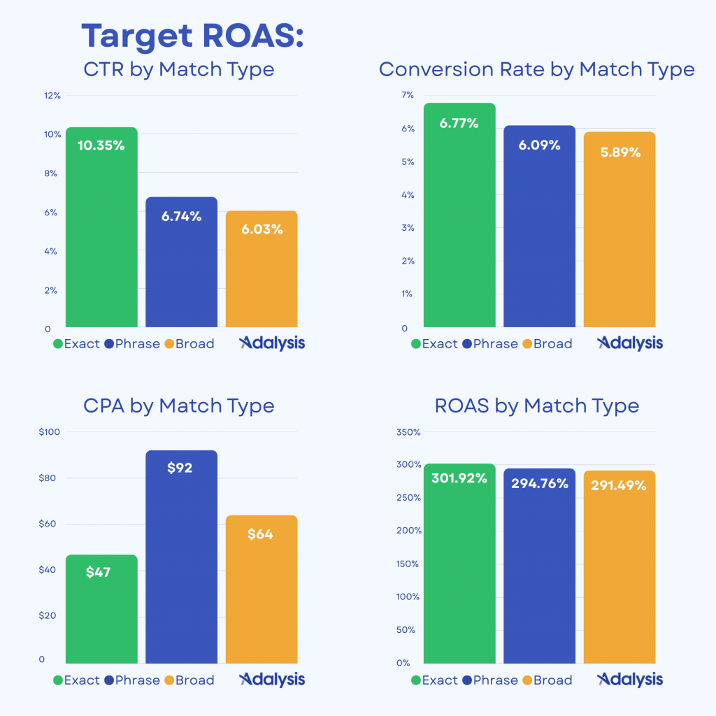 For ROAS, exact match dominates with 615% versus 341% for broad match.