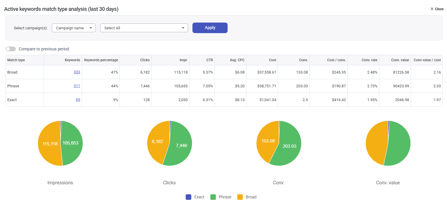 These campaigns contribute a significant amount of data to the analysis. Despite this, phrase match still has a worse CPA than broad match, and only slightly higher ROAS.