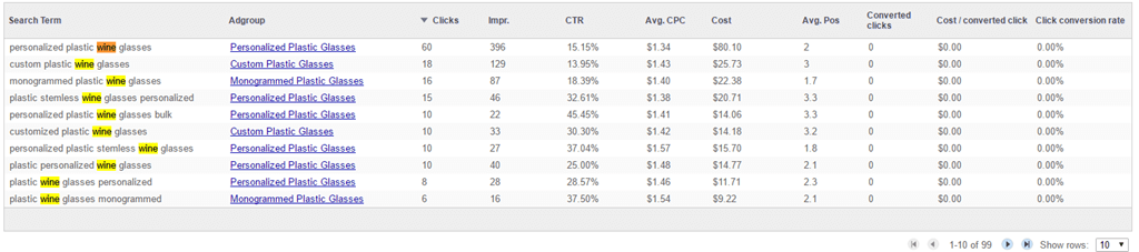 In this case, you would have ended up with at least 99 negative queries (there are 99 distinct search queries with the term wine) to block all of this traffic instead of just making a single negative keyword (-wine) to block everything since you can see the root cause of this poor traffic.