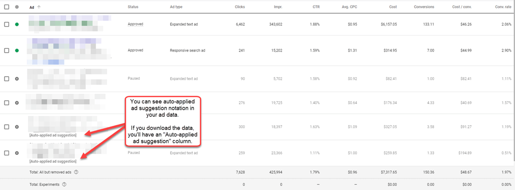 If you download the data, you’ll have a column that lists Yes or No for the auto-applied ad suggestion status.