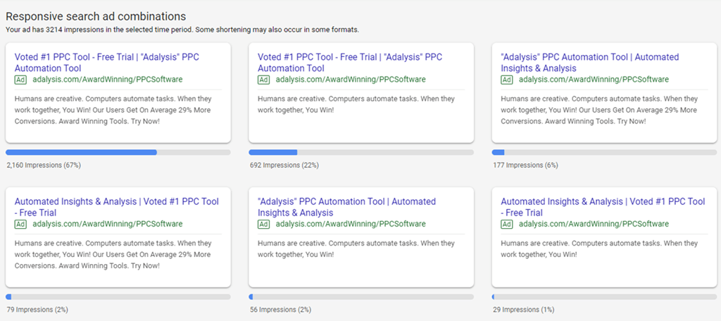 Responsive Search Ads allow you to create multiple headlines and descriptions and then let Google do all the optimization work for you. When the ad format first launched, we had high hopes that RSAs would allow us to get lots of stats for ad testing, easily find top combinations, and then create ETAs that were based upon huge amounts of machine learning testing.