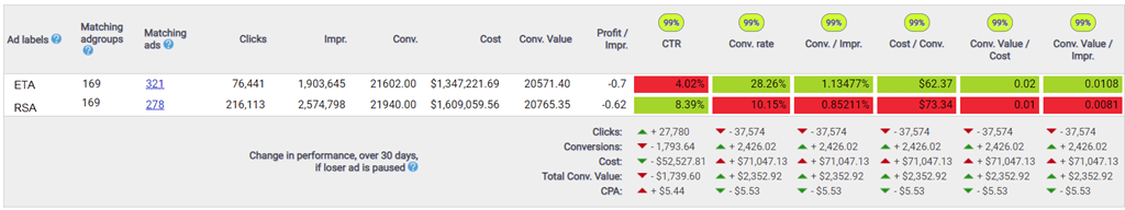 You can easily test RSAs vs ETAs by just putting both ad formats in an ad group. This is a very common ad test result when testing RSAs vs ETAs: