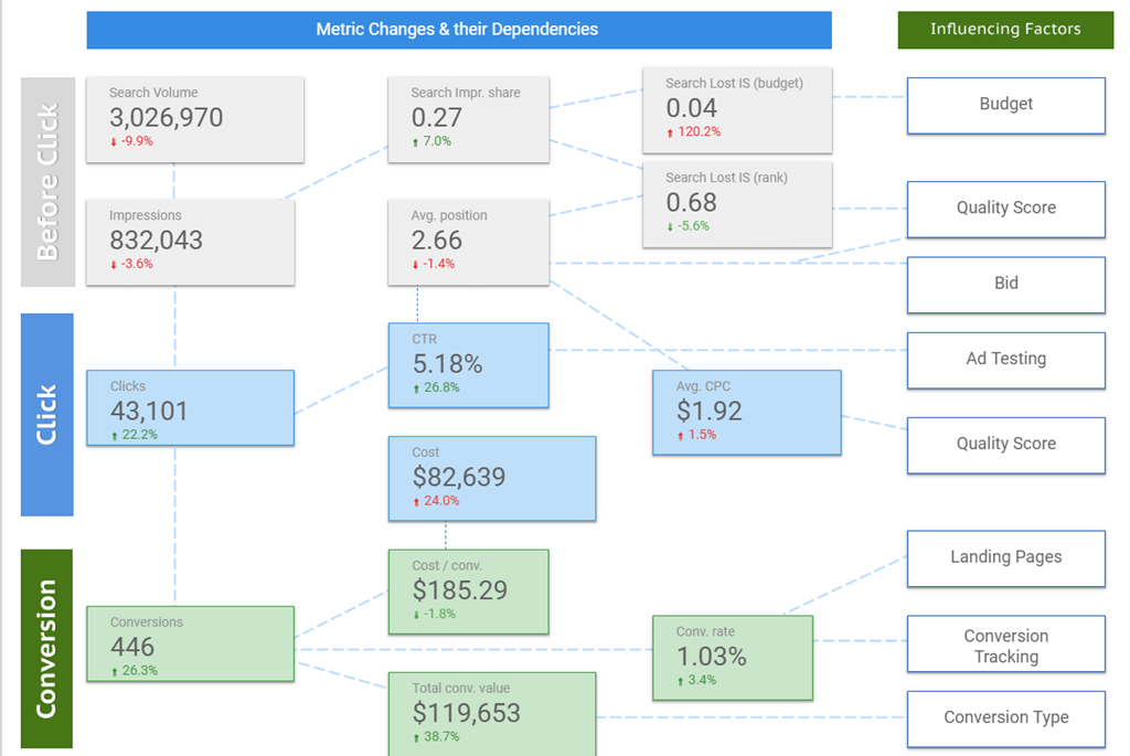 Once you know there’s an issue; then you need a quick way to visualize the factors that affect that KPI, like this Data Studio report (also automated within Adalysis) that shows you how your metrics changed and what influences those metrics.