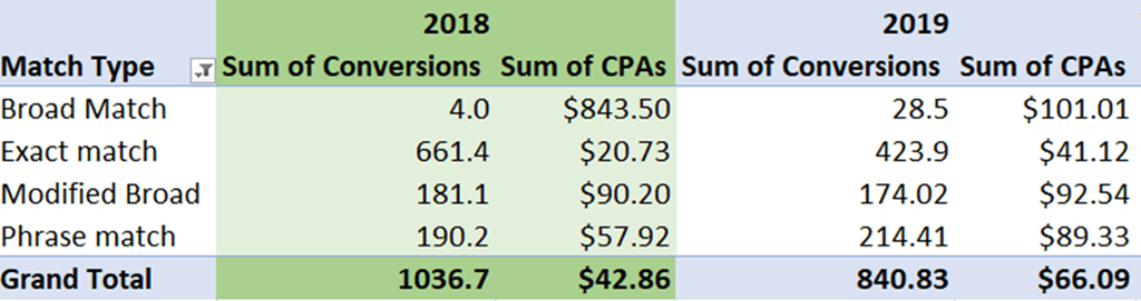 For example, in this account, if we examine October 2018 vs. October of 2019, we see their exact match CPA has doubled, and their phrase match CPA has increased dramatically: