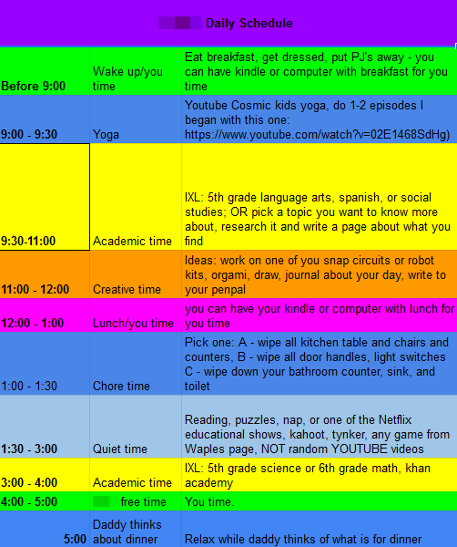 If you have kids, they are probably home from a cancelled school day right now and looking for something to do. Creating a routine for your kids that involves self-learning so, they are not constantly interrupting you is essential. Here’s our 5th grader’s schedule while she’s home from school: