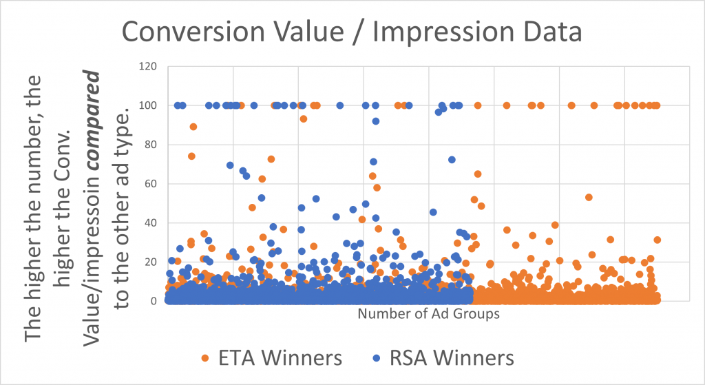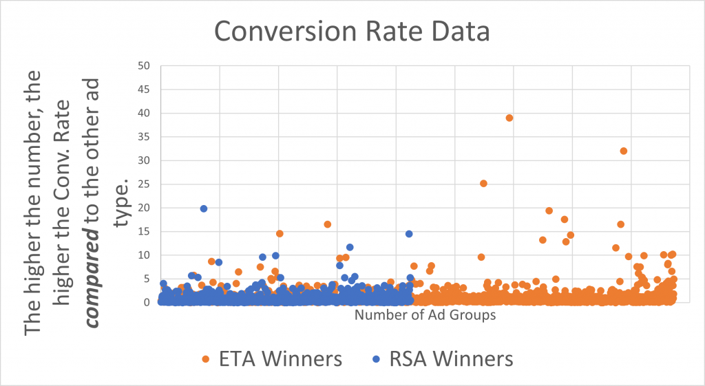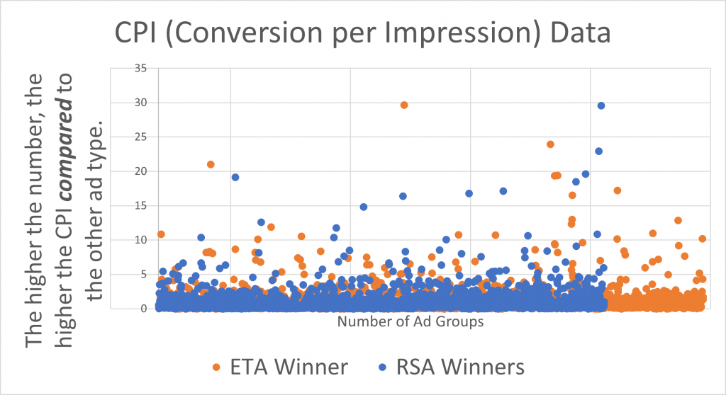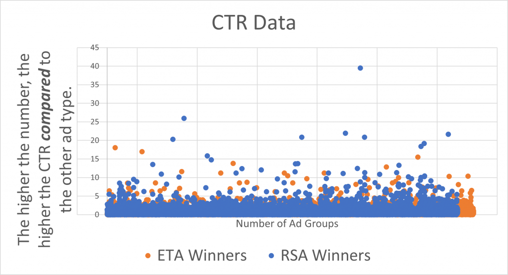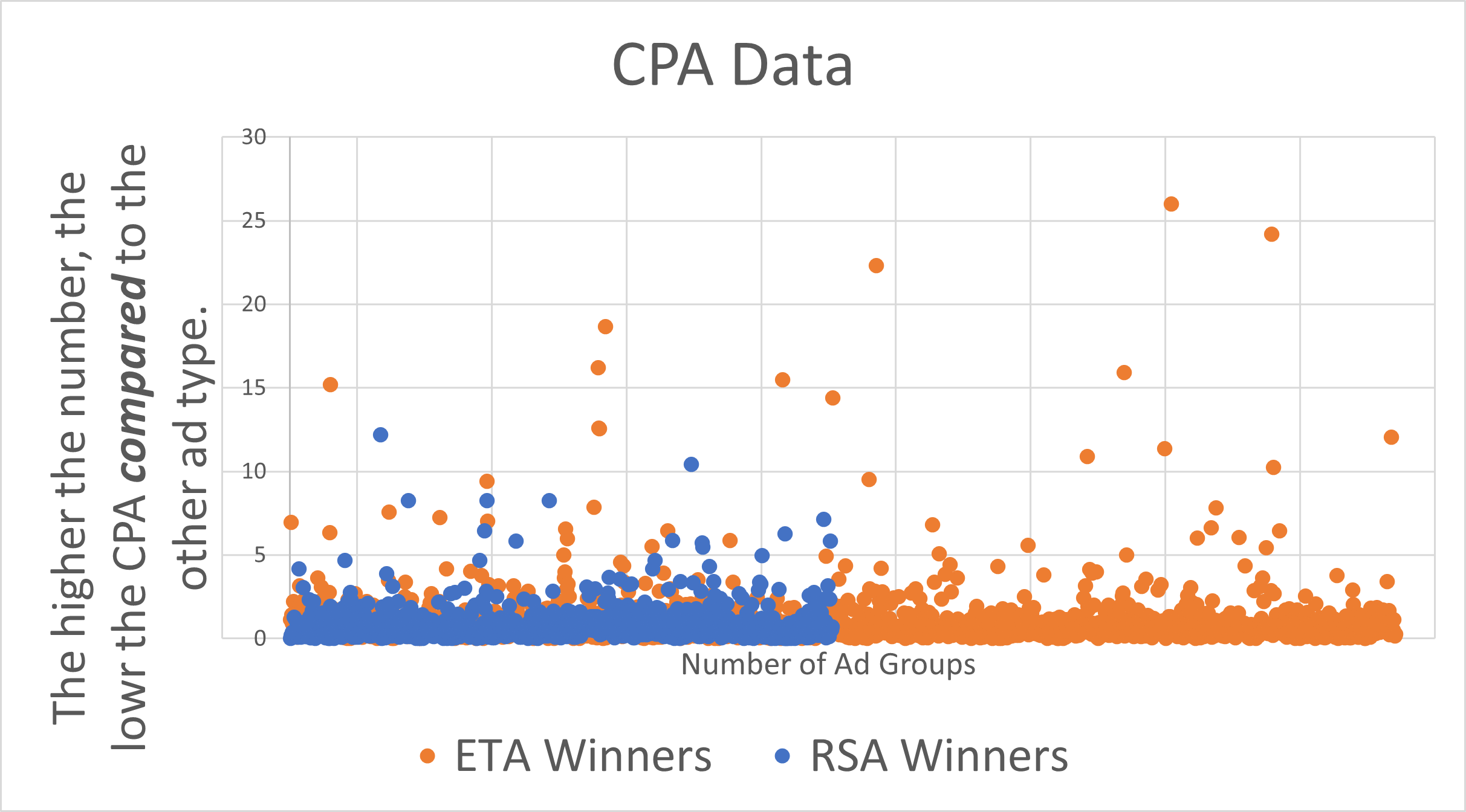 • Each dot represents one ad group. A blue dot represents an ad group where the RSA outperformed the ETA while an orange dot represents an ad group with an outperforming ETA.