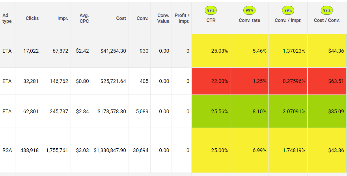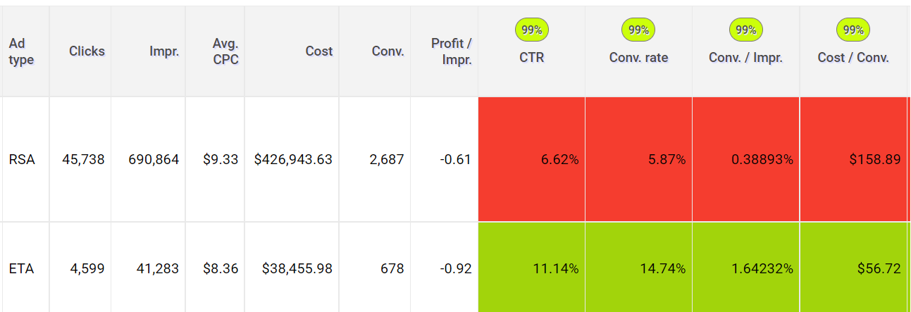 This was a huge surprise to us. We expected RSAs to at least win by CTR as Google is excellent at optimizing CTR. While ETAs barely won, it was still unexpected.