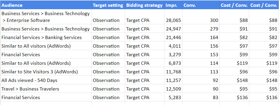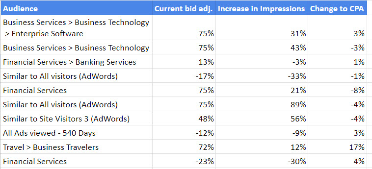 We can see that the first two bid adjustments, which are +75% had a substantial increase in impressions, however, they were lower than the bid adjustment. We did have one audience that was more general (Similiar to All visitors) that had an increase in impression greater than its modifier. We also had one audience (Banking Services) with a positive adjustment that had a small decrease in impressions.