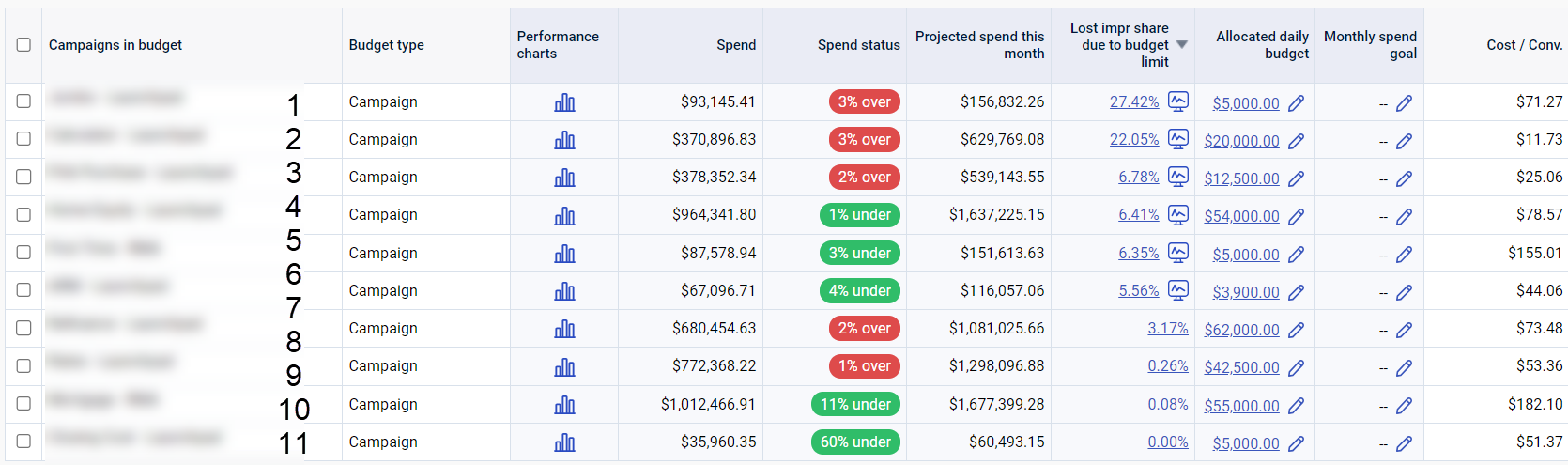 For instance, campaign 2 is losing 22% of its impressions due to budget. It also has the lowest cost per conversion of every campaign in the list. Moving some budget over from another campaign would gain more conversions without spending more. (Budget management tools can automate this type of budget manipulation.)